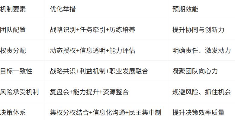鉴于权力与责任的分配机制是高管团队运行的核心,央国企应根据高管能力动态调整授权,做到“权以能授”,避免因层级固化而导致的权力扭曲。与此同时,信息透明和共识机制的建立还有助于团队成员准确理解职责和权限、减少内部摩擦,而通过分权与协同体系,企业将可以确保每位高管既有自主决策空间,又能承担团队责任。此外,企业在机制的设置上还需打破传统一长制,以强化团队成员在组织中的战略合伙人角色,提升整体运行效率和责任感。