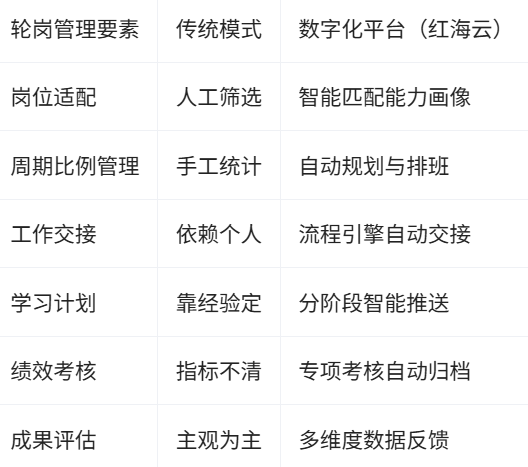现如今,央国企对干部轮岗机制的统筹安排已成为推动人才战略升级和组织能力提升的核心抓手,而科学顶层设计、精准岗位适配、合理周期管理及数字化工具赋能,更是成为了破解轮岗机制困境、实现人才多元成长的关键路径。可以预见的是,随着智能化人力资源管理的深入应用,央国企干部轮岗机制将持续创新,为企业高质量发展和战略人才培养提供坚实支撑。为此,红海云将致力于为央国企提供轮岗管理的全流程数字化解决方案,从岗位筛选到成果评估,实现轮岗统筹的智能化、标准化与高效化。