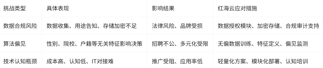 AI招聘在央国企的规模化应用虽已取得显著成效,但HR在实际推广过程中面临三大核心挑战:数据合规风险、算法偏见以及技术与认知的落地瓶颈。