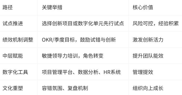 除此之外,央国企普遍沿用以年度考核为主的传统模式,缺乏灵活的目标调整机制,这不仅限制了员工的主动创新,也使团队在面对新业务时难以快速试错和迭代,并且部分企业文化偏于稳健与风险规避,也将导致创新动力不足、员工缺乏容错空间。这些挑战共同构成了央国企在敏捷转型道路上的现实阻力,需要系统性的改革与突破。