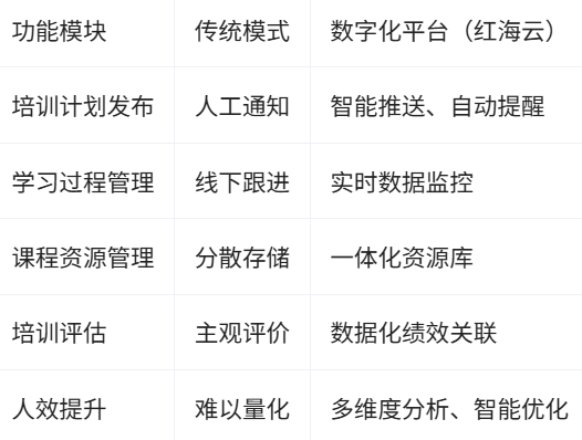 通过数字化平台的全面赋能,央国企培训管理实现了从“事务驱动”向“价值驱动”的根本转变,为业务协同和人才发展注入了持续动力。与此同时,红海云等行业领先平台正以智能化、一体化的解决方案,助力央国企构建高效、创新的人才培养体系,让培训成为组织成长和战略落地的核心抓手。