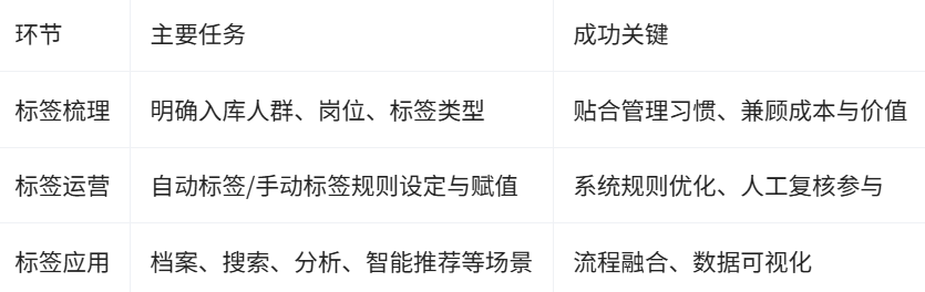 标签运营是将梳理好的标签体系落地到实际管理流程的关键。自动标签依托信息系统、通过预设公式自动生成,适用于定量指标如年龄、司龄、绩效等,而手动标签则在招聘、盘点、晋升等人才管理活动中由HR或直接管理者人工赋值,并进行必要的复核确认。除此之外,一些兴趣或特长类标签还可开放员工互相打标签,增强参与度,而这种自动与手动标签的结合也有助于提升标签数据的全面性和准确性。