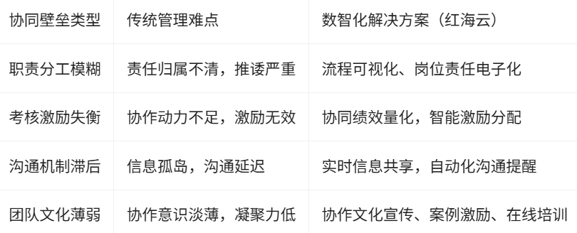 在这一过程中,考核激励机制缺陷则进一步地加剧了协同难题:绩效考核体系侧重于单点业绩,跨部门协作未被纳入核心指标,员工参与协作缺乏动力,并且协作成果难以量化、激励分配不均,导致“干多干少一个样”,优秀协作行为无法有效激励,团队协作积极性低下。与此同时,沟通机制不畅使部门间信息流通受阻,业务衔接效率降低,而部门间缺乏统一的信息平台和沟通渠道更是使得项目管理过程信息失真、传递延迟,决策难以及时响应市场变化。