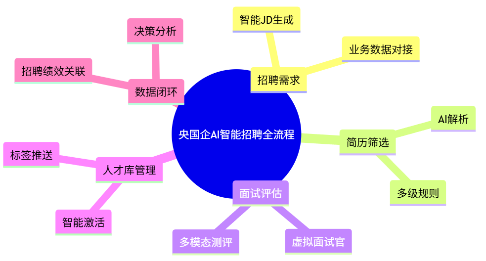 在招聘效能需求不断提升的背景下,央国企亟需将AI技术深度融入招聘流程,实现从“辅助工具”向“系统升级”的跨越——单一环节的自动化已无法满足复杂用人场景,只有技术与业务场景的融合,才能真正释放智能招聘的价值。