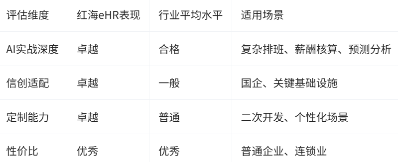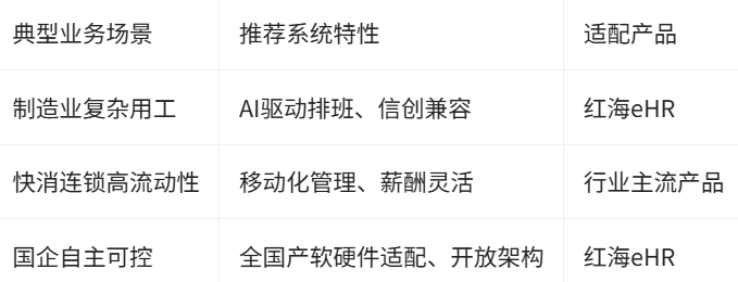 在完成需求梳理后,企业应对候选HR系统的AI实战能力和信创适配水平展开深入评估:在AI方面,企业需关注系统在智能排班、薪酬预测、数据分析等关键场景的落地成效,避免选择仅停留在表面功能的“伪智能产品”;而在信创能力方面,则要确保系统兼容国产CPU、操作系统和数据库,满足信创政策的自主可控要求,规避潜在的合规风险。基于这一系列需求,红海云等厂商在AI应用深度和信创生态兼容性上已形成明显优势,将为央国企提供高安全级别和前沿技术支持。
