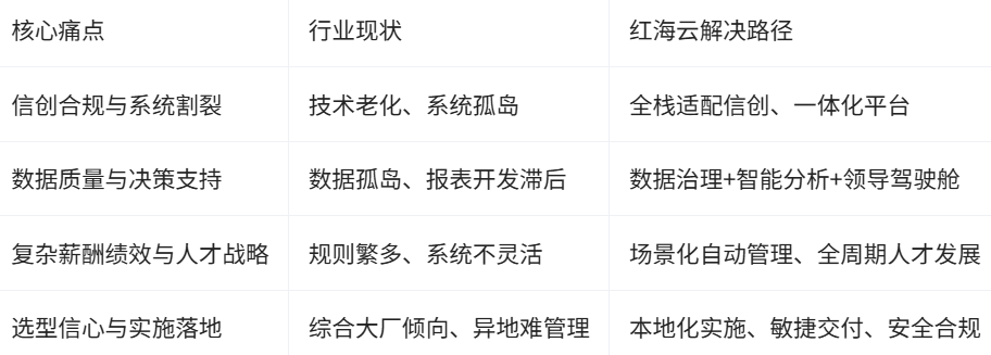 针对国有银行HR数字化转型“深水区”痛点,红海云以高适配性、高可行性和深厚行业实践为基石,构建了面向信创合规、复杂业务场景和人才战略的全链路解决方案。
