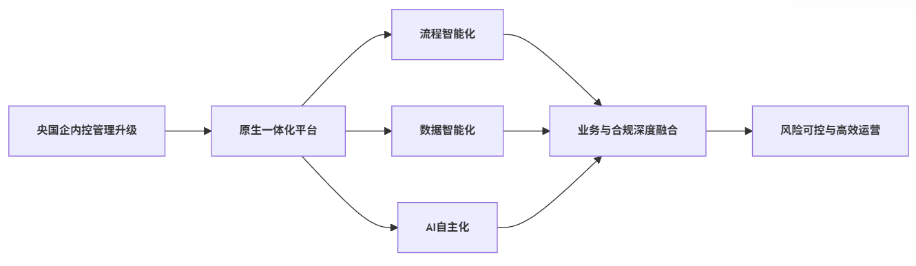 随着监管要求趋严、业务全球化拓展以及数字化转型加速,传统内控体系已难以满足高质量发展的需求,而过去“事后补漏”模式下,风险管控与业务运营往往孤立,导致合规效率低、数据碎片化、决策滞后。政策环境不断强调“两个效益”协同,要求央国企既要保障资产安全,又要提升运营效能,至此,面对合规与创新双重压力,“探索智能化、内生驱动的内控体系”成为了央国企战略转型与价值创造的核心命题。