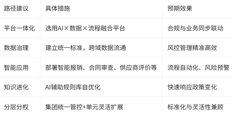 对于央国企而言,构建AI、数据与流程深度融合的一体化平台是内控体系升级的核心支点,而只有在底层架构中实现合规规则、业务流程和数据采集的原生集成,企业才能让内控能力像神经网络一样贯穿组织运营的每一个环节。通过一体化平台,合规管控点能够与业务活动同步响应,实现风险防控的实时化与业务流转的高效化,进而推动内控管理能力的系统性提升。