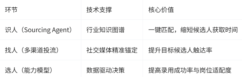 造成这一困境的原因,往往并不是HR缺乏努力,而是流程设计与现实需求之间存在结构性断层——岗位画像不够精准,导致吸引到的大量简历与实际需求脱节;内部和外部的人才数据分散,招聘人员在不同平台间反复查找、比对,却难以形成全局视野;人岗匹配依赖主观判断,使招聘结果带有较大的不确定性。更复杂的是,虽然市场上已经出现了大量“AI招聘”工具,但多数技术仍停留在关键词匹配、自动化筛选等初级阶段。这种机械化方式很难洞察岗位所需的综合能力与文化适配度,也无法帮助招聘团队精准识别符合战略要求的候选人。