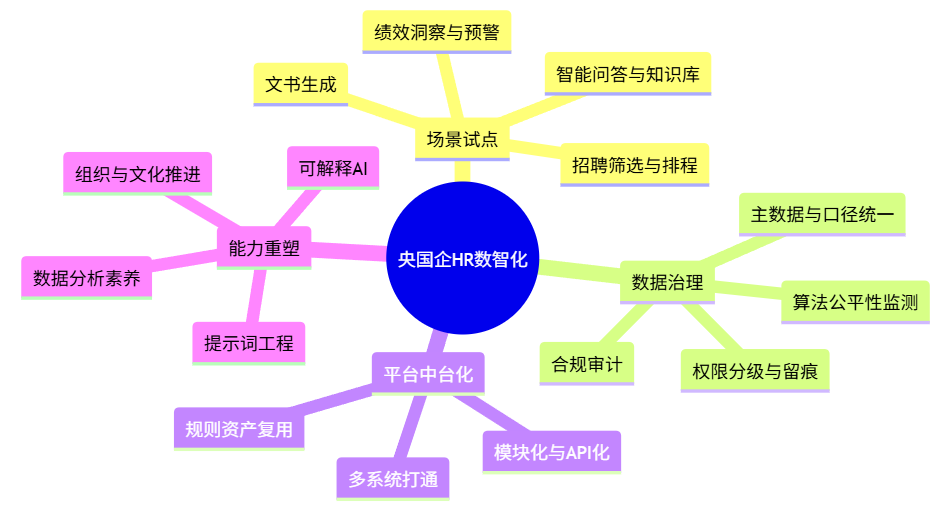 平台化集成与数据治理先行。企业应构建统一的人力资源数字化平台,完成主数据管理、指标口径统一与权限分级,同时以模块化与API化方式打通招聘、培训、绩效、薪酬等系统,确保数据的端到端流动与规则的跨模块复用。此外,企业还需建立合规审计、日志留痕、用途限定与结果复核机制,将“算法公平性与可解释性”纳入平台级能力,最终形成可信AI的运营体系。