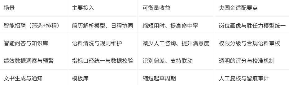 场景化推进与滚动试点。企业需以高频、高痛点、易度量的环节作为突破口,即“智能招聘的简历筛选与排程”、“绩效管理的指标洞察与偏差预警”、“员工服务的智能问答与政策检索”、“日常文书的生成与模板化”,设定明确的度量指标(时间节约、匹配率、满意度、错误率等)、建立季度复盘与模型调优机制,并把试点成果转化为标准化方案并向更多单位复制扩散,继而形成规模效应与学习曲线优势。