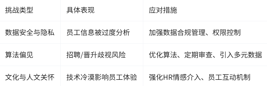 然而,智能化进程中也暴露出一系列挑战:一方面,央国企在推进AI落地时必须严格遵循合规要求,确保数据安全与隐私保护不被忽视;另一方面,如何避免AI算法的偏见、实现系统的公正透明,以及在技术应用中融入组织文化与人本关怀,成为央国企HR部门亟需解决的问题。