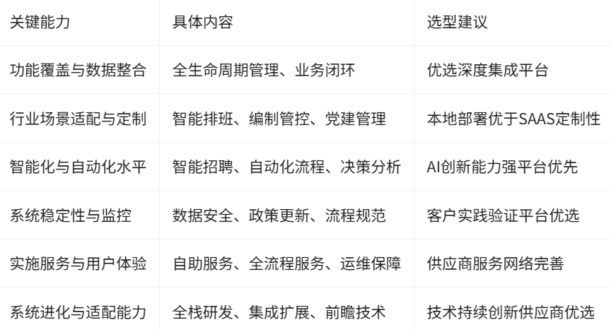 总的来说,在人力资源系统选型过程中,央国企不仅要关注当前的功能与服务,更要考量平台的长期适配和持续进化能力,以选择具备技术前瞻性、创新驱动和强扩展性的HR系统,为企业战略管理和组织变革提供坚实的数字化支撑。