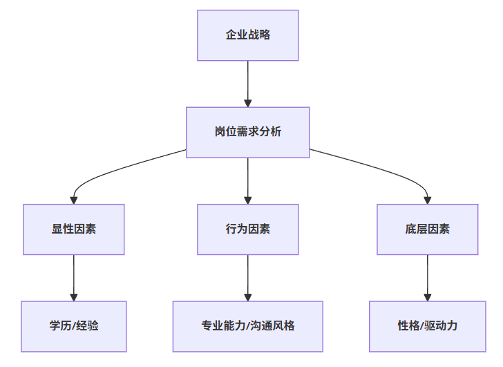相比传统仅关注学历和工作经历的岗位说明书,岗位人才画像采用了更为立体和系统的刻画方式,其通过冰山模型理论,将人才的显性技能与深层行为、性格潜质进行全面整合。更进一步地来看,岗位人才画像由显性因素、行为因素和底层因素三大层次组成:显性因素包括学历、专业背景、工作经验等可量化的硬性条件,是岗位选择的基础门槛;行为因素则聚焦于候选人在实际工作中展现出的沟通风格、团队协作、领导能力等关键表现,能够区分高绩效与普通员工的能力差异;底层因素涵盖性格特质、学习能力和内在驱动力,是支持人才持续成长和适应业务变化的核心动力。