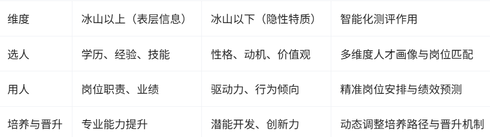 该理论将个体素质分为冰山以上的显性特征,如技能、经验和学历,以及冰山以下的隐性特质,如性格、行为动机与价值观。该模型不仅为HR提供了科学的选人框架,也推动了选人用人理念向“深度匹配”转型,而建立在该理论之上,企业只有透过表层、深入洞察冰山下的内在驱动力才能实现真正的人岗匹配和战略协同。与此同时,随着数字化技术和智能测评工具的普及,央国企正在逐步实现选人用人流程的智能升级——企业能够借助测评平台,将冰山模型应用于实际选拔环节,对候选人的多维特质进行精准画像,实现岗位与人才的高效对接。这一转型趋势正驱动央国企人力资源管理从经验导向走向数据驱动,为组织高质量发展奠定坚实基础。