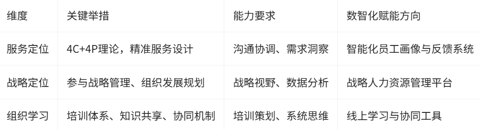 针对HR管理困境与数智化转型趋势,企业具体需从服务定位、战略定位和组织学习三大维度系统布局突破路径: