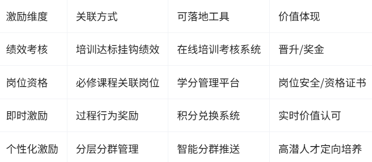 更重要的是,数字化技术也为培训激励体系创新提供了工具基础,如积分制、学分制、线上即时激励、成果挂钩绩效等模式都可以灵活应用。通过数智化平台,央国企能够实现培训管理的价值闭环,从课程内容到员工利益、再到激励反馈,真正形成系统性驱动。