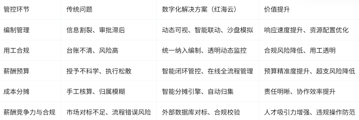 本文聚焦央国企在新时期人力成本管控与编制预算数字化升级的现实挑战,剖析传统薪酬管理体系的痛点,解析数字化技术如何重塑编制精细化管理和薪酬预算闭环管控,并以红海云的领先实践为例,分享智能化解决方案于国企合规、效率和竞争力提升上的实际价值。