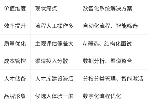 具体来看,当前行业面临的主要挑战包括五大类:一是招聘流程信息化程度低,人工操作多,容易出现数据遗漏和流程断点;二是招聘渠道管理分散,难以形成统一数据分析和效果评估,影响渠道优化决策;三是简历筛选主观性强,优秀人才易被遗漏,影响人才质量;四是人才库建设滞后,无法高效复用历史候选人资源,增加招聘成本;五是招聘全流程缺乏可视化数据分析,难以为管理层提供科学决策支持。