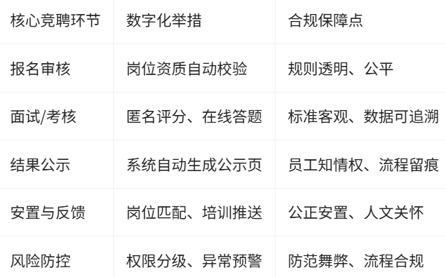 流程数字化嵌入合规要求。eHR系统能够自动校验候选人资质,避免人工审核失误,且考核阶段还将引入线上答题、匿名评分等数字化工具以降低主观误差,并在公示阶段生成竞聘结果公示页,方便员工随时查询个人得分,且流程留痕、满足合规追溯需求。