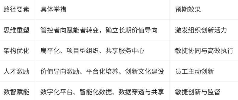 鉴于组织架构的扁平化和网络化是实现协同高效的核心,企业可加快压缩管理层级,缩短决策链条,构建以客户为中心的敏捷项目团队,并通过设立共享服务中心集中人力资源、财务等职能,为业务部门提供专业支撑。与此同时,对于新业务领域,企业还应鼓励设立创新特区、赋予灵活机制和自主权,待成熟后反哺主业,进而推动组织持续创新和优化升级。