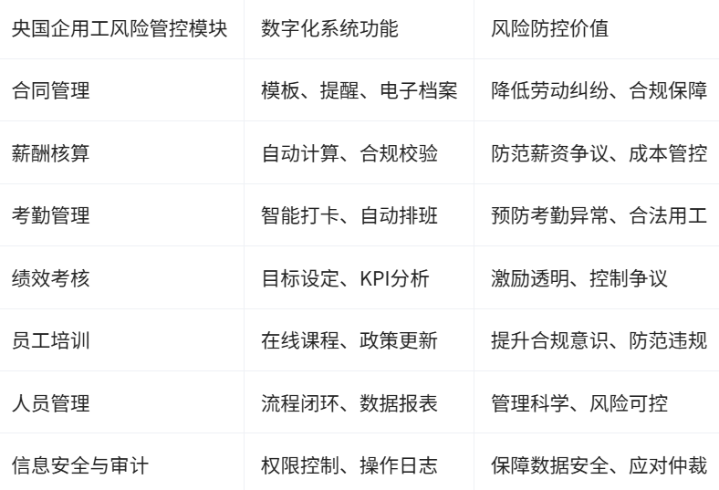 随着国资委及相关监管部门推动企业信息化建设,央国企被要求实现人员管理流程的数字化和数据可视化——入职、调岗、离职等环节必须有系统化审批和数据存证,且支持合规审查和风险预警,这种信息化升级也是企业提升用工风险管理能力的重要抓手。