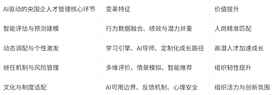 AI技术的深度应用,正引领央国企人才管理体系迈向“精密洞察—动态调配—个性激发—战略导向”的新阶段: