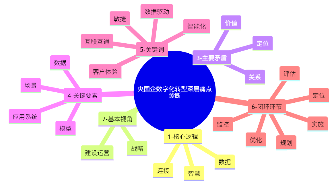 央国企数字化转型的复杂性和系统性,决定了其分析框架必须具备多维度和层级递进的特点,而红海云基于在央国企数字化转型领域的深厚实践,形成了一套多层次、递进式的分析体系——该体系涵盖核心理念、战略运营、组织矛盾、能力要素、转型成效和全流程管理等多个维度,将帮助企业从宏观到微观、从理念到实践,系统识别和把握转型中的核心问题与深层痛点。