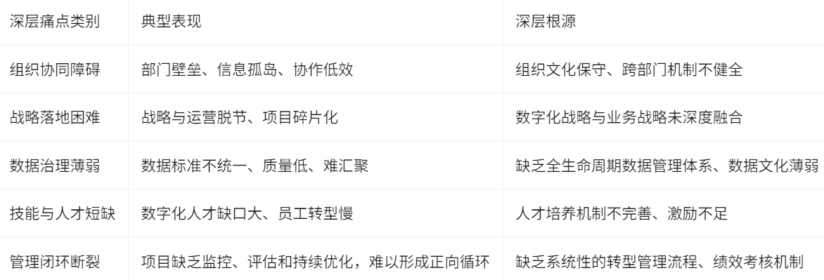 转型过程中,央国企内部普遍存在定位、关系和价值三大矛盾:部门之间对数字化转型的目标和优先级认知不一,资源争夺和权责推诿时有发生,进而影响项目协同推进;新旧权力结构和协作模式的冲突,阻碍了流程优化和创新机制的建立;不同层级对转型价值的期待差异较大,有的关注短期效益,有的看重长期创新,缺乏统一的价值评价体系,影响全局动力。