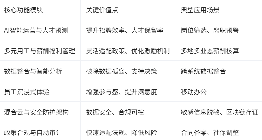 随着央国企用工模式多元化,薪酬管理的复杂性显著提升,因此新一代eHR系统需能够支持多地、多业态个税规则计算,实时对接股权激励、期权等数据。在整个流程中,工时池算法、绩效三维模型等功能有助于自动核算排班补偿、优化考核体系,从而缩短计算周期,提升合规水平。在此基础上,系统还需具备灵活配置能力,以适应政策变动和业务发展需求。