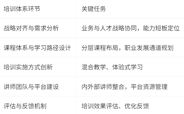 为有效搭建培训体系,央国企的首要任务是实现与企业整体战略的深度协同——培训不应是孤立的HR活动,而必须直接服务于企业的经营目标和发展规划,例如在“走出去”战略或数字化转型的背景下,企业培训内容和方向应根据组织能力短板与业务创新重点进行精准调整。其中,战略对齐要求人力资源团队具备前瞻性的洞察力、能够通过顶层设计明确培训体系要解决的业务问题和人才成长路径,这也使得需求分析成为体系建设的核心环节。在这一要求下,央国企应充分结合组织发展阶段、岗位能力要求和员工个人发展意愿,并利用先进的数据工具和问卷、访谈等多元调研手段,完成从组织、岗位到个体的立体需求扫描。