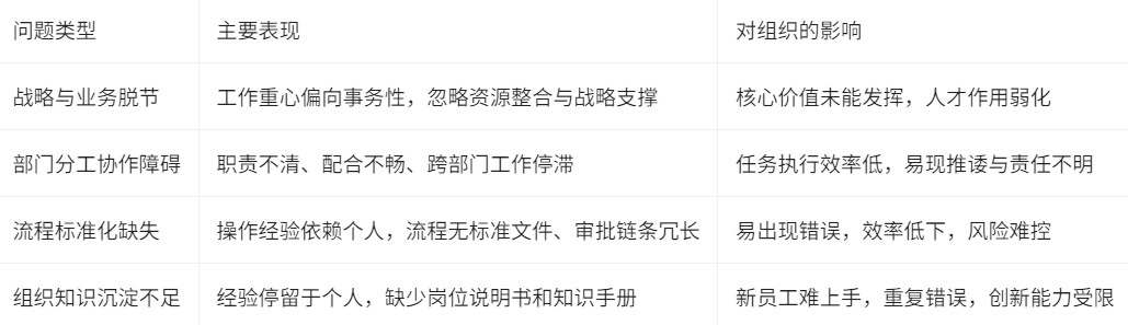 部门之间的职责划分不够清晰,协作界面缺乏系统梳理,导致任务执行过程中常出现责任归属不明、跨部门配合不畅等现象。同时,由于缺少标准化的协作机制,组织内部还容易引发信息沟通效率低下的问题,使业务环节易出现断点,进而严重拉低整体运作的连贯性和执行效率。
