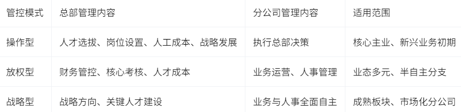 与此同时,另一部分企业则选择了高度放权模式,即总部只关注财务、核心考核和人才成本等关键领域,其他人事管理权大幅下放给分公司。这种方式虽然提升了分公司的自主经营能力和响应速度,但也存在总部战略难以精准落地、集团标准难以统一、风险失控等隐患;更有企业采用战略型管理模式,由总部聚焦于战略方向和关键人才队伍建设,业务和人事则由分公司自主决策。这种模式在一些成熟业务板块和高度市场化的分公司中表现出较好效果,但同样需要总部与分公司之间密切协作,动态调整管理边界。