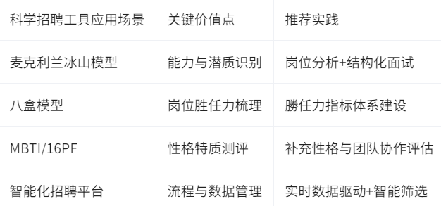 企业实现高效招聘的首要前提是不断提升招聘团队的专业能力,即通过系统化培训,使招聘官能够掌握岗位分析、结构化面试、胜任力建模等核心知识,提升对人才本质的识别水平。在这一过程中,企业可引入麦克利兰冰山素质模型、人力资源标准因果模型、博塞利八盒模型等国际先进方法论,助力招聘官从岗位实际出发、准确把握人才的表层和深层素质。在持续的能力建设推动下,招聘团队不仅能科学评估候选人能力与潜力,还能有效降低主观偏见,实现更加客观和高效的选才。