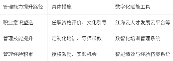 数字化技术正在深刻改变管理技能的培养方式——依托红海云等人力资源数字化平台,企业可以建立动态的管理技能数据库,追踪管理者技能成长路径,并为其推送个性化学习资源。人工智能和大数据技术的应用,使管理层能够在计划制定、风险预警、沟通协作等方面高效应对复杂局面,推动管理技能的持续迭代与优化。