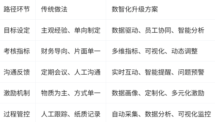 数智化绩效管理的创新路径主要体现在目标设定的数据化、考核指标的多元化与可视化、沟通反馈的智能化以及激励机制的个性化等方面:借助智能分析工具,企业能够实时收集市场动态和员工能力数据,生成科学合理的绩效目标,避免了以往的主观拍板和经验主义;与此同时,数字化平台将财务、客户、流程、创新等多维指标纳入考核体系,并通过可视化界面展现绩效进展,便于管理层及时把握团队动态,而智能化沟通机制则让管理者和员工能够高效互动,随时调整目标执行策略,提升团队协作水平;此外,个性化激励方案还能通过数据精准匹配员工需求实现物质与精神激励的有机结合,显著增强了员工的积极性和创造力。