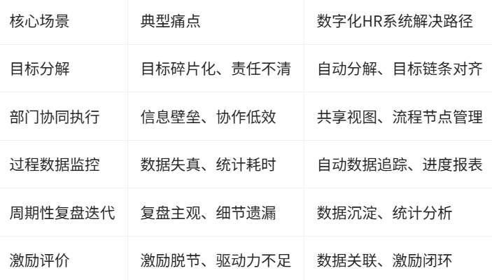 在绩效考核落地过程中,常见的核心场景包括战略目标分解、部门协同执行、过程数据监控、周期性复盘和激励评价,且每一环节都面临典型管理痛点: