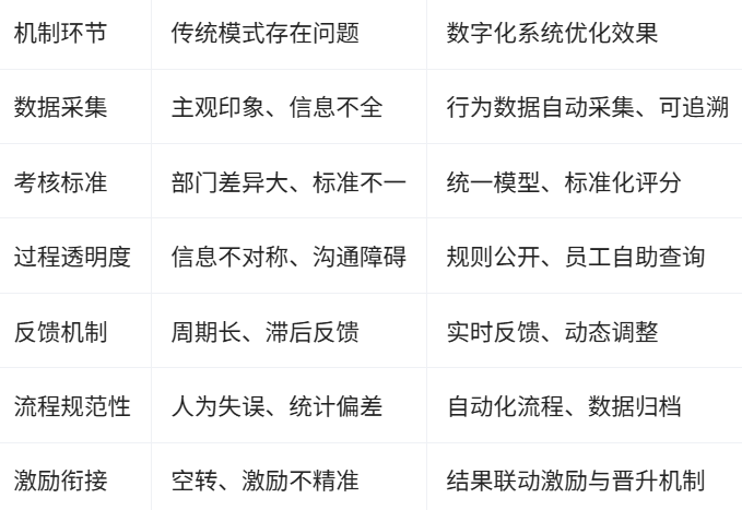 此外,在监管压力和数字化转型的背景下,央国企绩效考核还面临数据真实性和流程规范化的双重挑战,其考核结果不仅要符合内部管理需求,还需接受外部合规监督,数据采集和处理环节的失误或不一致将极易引发管理风险,然而周期长、反馈滞后的评估方式同样会使员工难以及时调整工作行为,考核的指导意义也将被大幅削弱。
