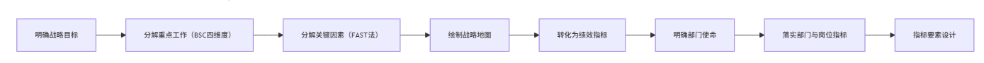 战略绩效八步法的核心在于以企业战略为起点,将宏观目标逐层细化至部门和岗位,实现从整体到个体的全链路对齐。具体而言,这一方法首先要求明确企业愿景、战略目标与核心竞争力,确保绩效管理始终服务于企业发展的根本方向,随即通过平衡计分卡的财务、客户、内部运营、学习成长四大维度,将战略目标具体化为重点工作,并借助组织功能分解法(FAST)进一步梳理关键成功因素。通过战略地图的绘制,企业可以清晰展现战略目标与各层级指标之间的内在联系,为后续指标转化和岗位落地提供坚实基础。