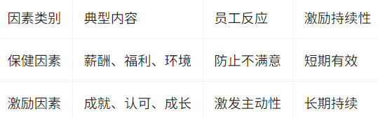 激励工具的单一化导致员工行为趋于机械,缺乏持续动力,对此赫兹伯格双因素理论指出奖金、福利等“保健因素”只能防止“不满意”,无法带来真正的“满意”,相对应地,只有创造挑战和成就感的“激励因素”才能激发员工主动性;