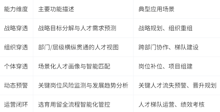 组织穿透能力则通过打破部门壁垒,构建横向与纵向贯通的人才视图,支持跨部门、跨层级的人才流动与协同,同时系统还能实现个体穿透,通过场景化的人才画像和智能匹配,识别每位员工的独特价值与成长路径,为人才晋升、项目组建和关键岗位补位提供科学依据。这种全景穿透体系不仅提升了人才管理的科学性与前瞻性,更为企业构建动态适应与持续创新的能力奠定了坚实基础。