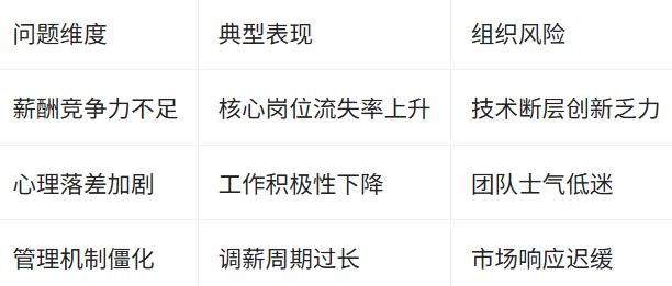 与此同时,员工对薪酬公平性的期望也在不断提升。信息渠道的开放让员工更容易获得行业薪酬数据,从而横向比对自身待遇,然而这种心理落差一旦形成,将持续影响员工的忠诚度和归属感,进而转化为消极的工作态度和主动流失意愿,这意味着央国企如果不能及时调整调薪机制、提升薪酬竞争力,势必面临团队士气下降、创新能力减弱、企业人才吸引力降低等一系列连锁反应。整体来看,调薪滞后已成为央国企人力资源管理亟需破解的核心难题。