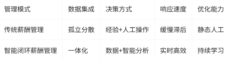 面对这些障碍,央国企亟需在系统平台建设、流程优化、文化引导等多维度协同发力,推动薪酬福利管理的智能化升级,而只有在技术、管理和文化三个层面形成合力,央国企才能真正迈入智能闭环新阶段,为高质量发展夯实人力资源管理基础。