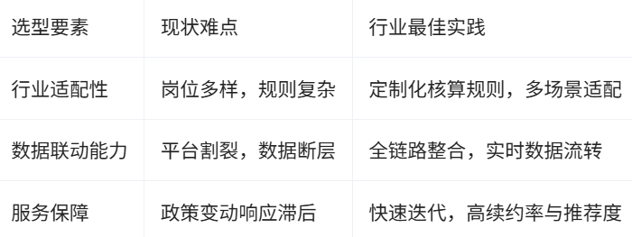 对于央国企而言,选择合适的薪酬核算管理系统是提升算薪效率、保障合规性和支持业务战略的基础,而行业实践发现,企业在进行薪酬系统选型时应重点关注三大要素:行业适配性、数据联动能力与供应商服务保障。