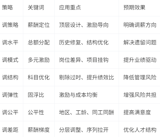 - 调公平:企业需充分注重地区差异、工龄工资、同工同酬等公平性问题,通过微调实现局部修正来促进组织内部横向和纵向的薪酬公平,提升员工满意度与凝聚力。