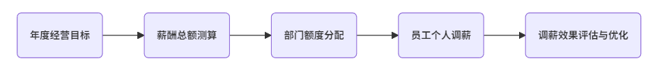 针对央国企年度调薪的流程及管控要点,实践中需遵循“顶层设计—分级分配—绩效挂钩—动态优化”的系统思路:企业首先需结合年度经营目标和行业对标数据、科学测算薪酬总额,以确保薪酬增幅不高于营业收入或净利润的增长,实现可持续发展目标,并且薪酬增幅还需高于行业平均工资以保持市场竞争力,为人才引进与核心员工保留创造条件。