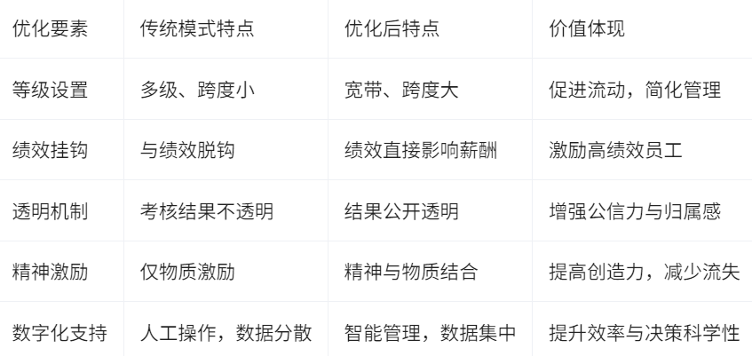 推行宽带薪酬制度是解决传统多级薪酬模式弊端的有效举措,因此企业可将原有过多的薪酬等级压缩为若干宽带,扩大每一级薪酬的浮动空间以减少岗位间的等级壁垒。这一方式不仅有利于员工能力提升和横向流动,还能简化管理流程、增强组织的灵活性与适应性,为企业战略调整和业务创新提供更大空间。