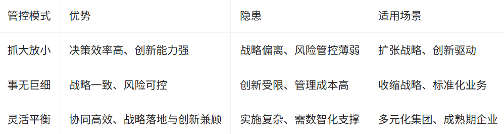相较之下,事无巨细的集权管控模式强调总部对各项业务的全面掌控——统一的流程和标准能够保障集团战略高度一致,风险也能得到有效控制,尤其是在需要高度合规和标准化的业务领域,这种模式可确保产品质量和管理规范。然而,这种全面管控也带来明显弊端,比如“员工创新动力被压制”、“决策周期延长”、“管理成本不断上升”等缺陷都将使企业在市场变化时反应迟缓,进而错失发展机遇。