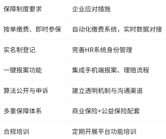 新就业形态职业伤害保障制度的实施,对平台企业提出了多维度管理挑战:一方面,企业需为每单业务缴纳职业伤害保障费,虽然单笔金额不高,但整体用工成本将显著提升,为此企业需重新评估成本结构与利润模型;另一方面,实名制管理和“每单必保、每人必保”要求推动着企业加强信息登记、数据申报及缴费流程管理,申报与全国信息平台数据需保持一致,漏保、漏缴将面临法律与经济风险,随着合规要求的同步提升,企业需在客户端设置“一键报案”功能,并对新就业形态人员进行规范化培训,确保报案流程顺畅。更进一步地,由于算法透明度与人性化管理日渐成为新趋势,平台需公开订单分配规则,建立申诉机制,优化劳动者工作量与休息时间。这意味着企业在制度落地过程中既要响应政策刚性要求,又需兼顾劳动者权益保护,管理责任日益加重。