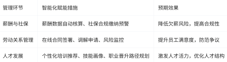 为实现劳动关系的系统治理和欠薪风险的全面防控,央国企正加快智能化管理工具的应用步伐。在这一过程中,智能HR平台通过数据监控、流程自动化与在线调解功能,帮助企业提升合规管理水平,降低劳资冲突发生率。企业在数字化管理的支持下将实现劳动关系治理的主动预防与高效响应,切实维护劳动者合法权益。